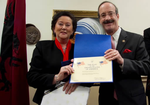 He gave to Mrs. Berisha the flag raised in her honor in U.S Congress and expressed his support and that of his colleagues of the U.S. Congress for the upcoming activities of Mother Teresa Cultural Foundation. On the occasion of the opening of this exhibition, Mrs. Liri Berisha held meetings with congressmen in the U.S. Congress: Eliot Engel, Jackie Speier, Betsy Markey, Rosa Delauro, Diane Watson, Jim Moran, Robert Aderholt, Alcee Hastings, etc. who praised the work of the Mother Teresa Cultural Foundation and Mrs. Liri Berisha for honoring and praising the image of great Albanian humanist.